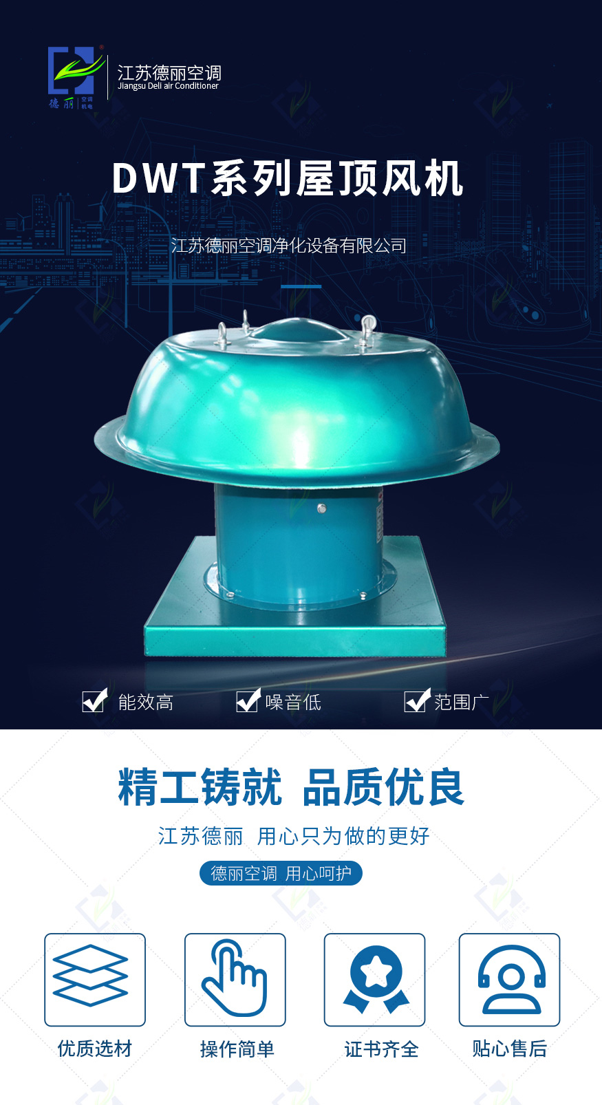 江苏德丽空调净化设备有限公司——DWT系列屋顶风机可用于高层建筑、地下建筑的防排烟系统。具有效率高、噪声低、用途广,平时通风接气与火灾时消防排烟一机两用的特点。